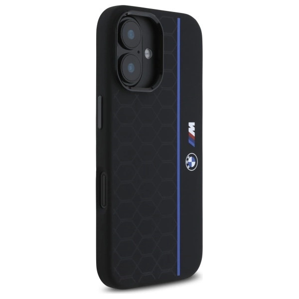 BMW BMHMP16S23SHEB iPhone 16 6.1", tok, fekete Silicone Hexagon tok, kék Line MagSafe