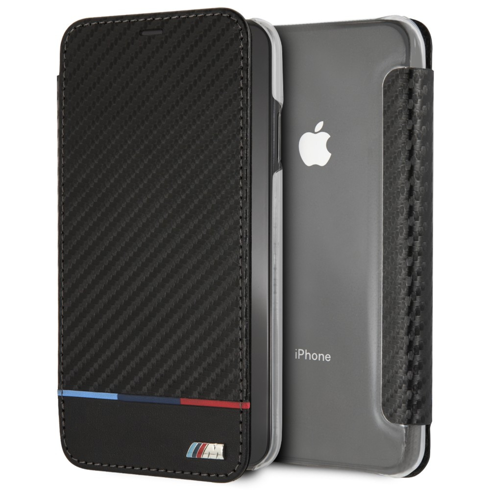 BMW iPhone Xs Max Carbon Tricolor Stripe (BMTRBKI65PUCARTCBK) oldalra nyíló tok, fekete