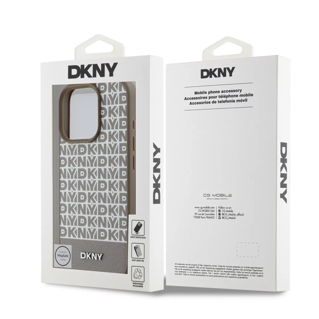 DKNY iPhone 16 Pro PU Leather Repeat Pattern Bottom Stripe MagSafe kompatibilis DKHMP16LPSOSPW hátlap, tok, barna