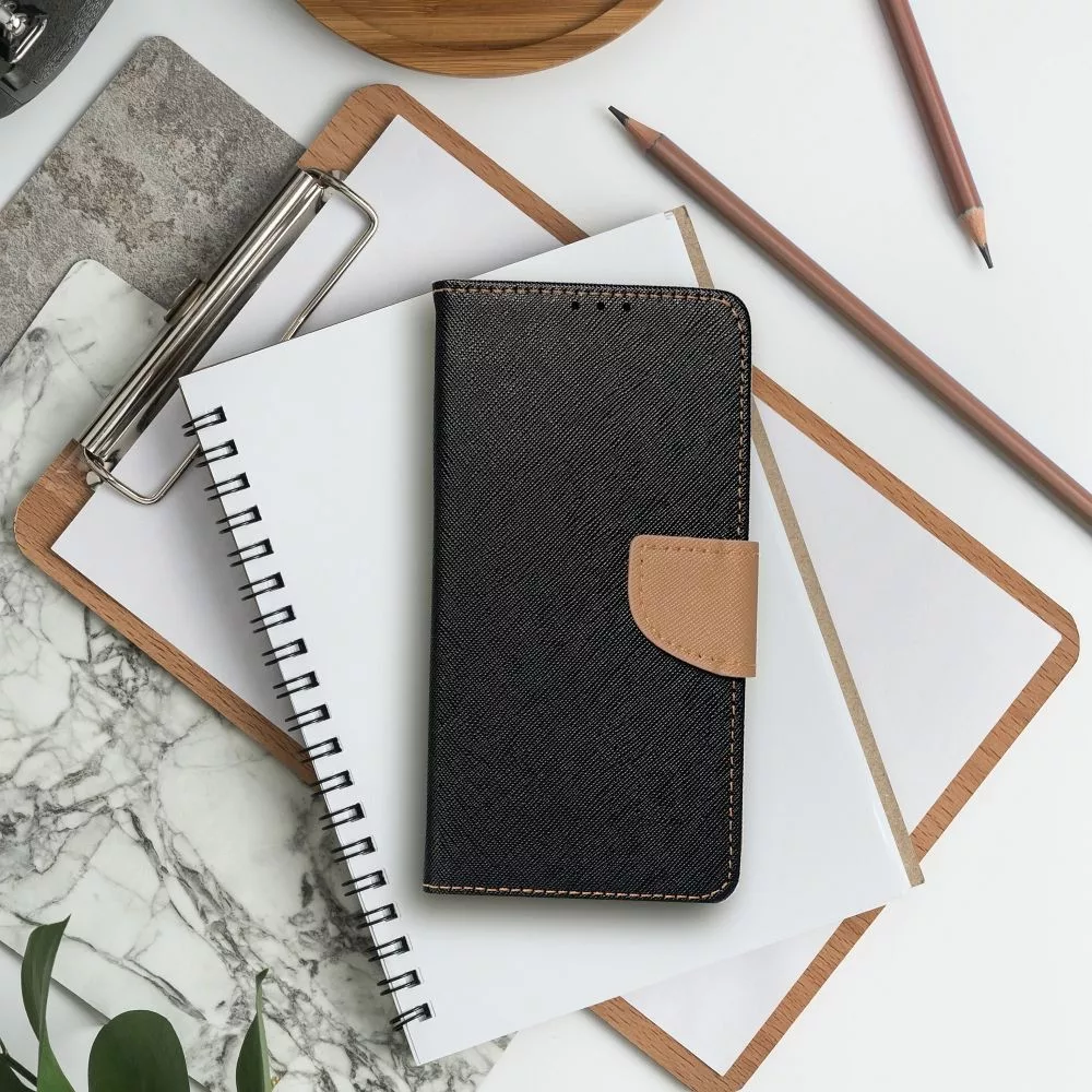 FANCY Book case for IPHONE 16 Plus oldalra nyíló tok, fekete-arany