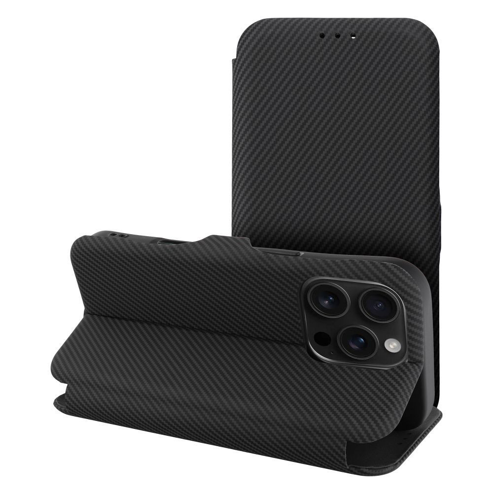 A Folio Side Magnet case tartós eco-bőrből készült. A felületét elegáns karbon mintázat díszíti, amely hangsúlyozza az eszköz modern jellegét. Az anyag közepes rugalmassága hatékony védelmet nyújt, miközben kényelmet biztosít.