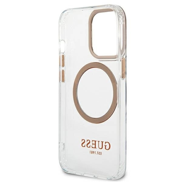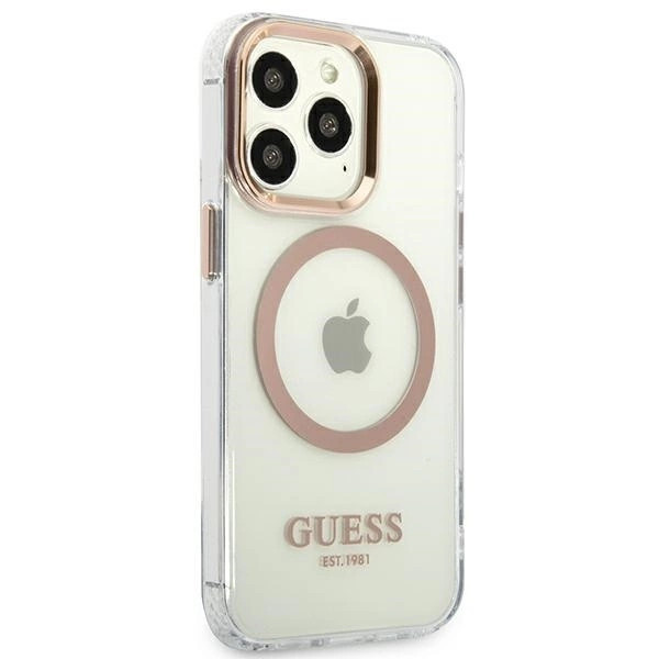 A tok tökéletesen kiemeli az iPhone egyedi dizájnját, aranyszínű elemekkel díszített, mint például a lencsék körüli keret, a gombok és a Guess logó. A tok a MagSafe vezeték nélküli töltővel kompatibilis mágneses gyűrűvel van ellátva, amely gyors és egyszerű töltést biztosít. A mágneses gyűrű tökéletesen illeszkedik a borító színeihez.