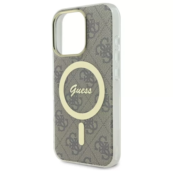 A tok kivételes eleganciájával tűnik ki, amelyet kifinomult részletek jellemeznek, mint a kamera körüli arany keret és a stílusos arany MagSafe gyűrű. A kiváló minőségű 4G nyomat, a Guess stílus ikonja, klasszikus, időtálló megjelenést kölcsönöz a toknak. A mágneses gyűrű belsejében a Guess logó finoman integrált, tökéletes összhangot teremtve a tok színvilágával, harmonikus, egységes egészet alkotva.