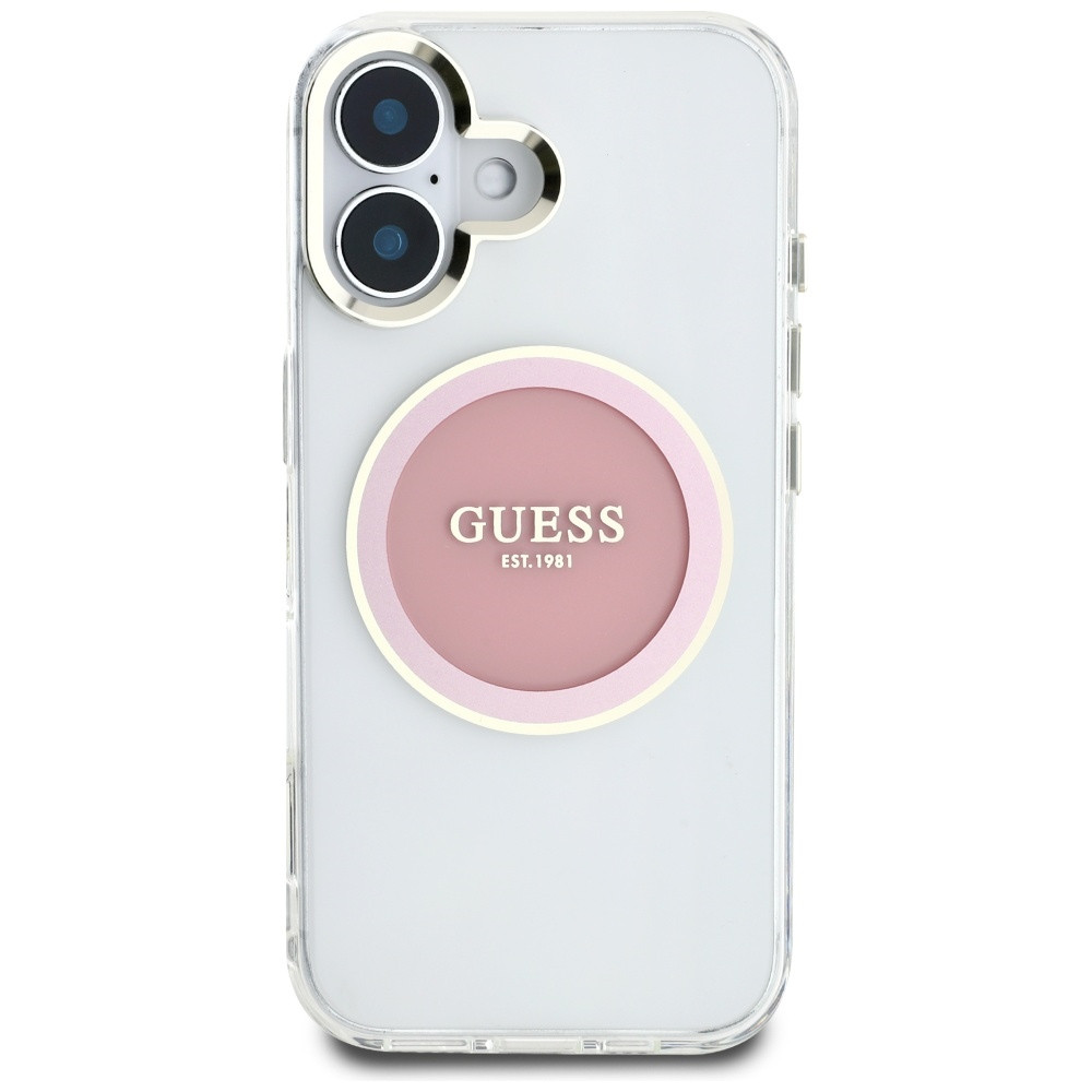 Guess IML Metal Colotok, piros Circle Classic Logo MagSafe iPhone 16 tok, rózsaszín