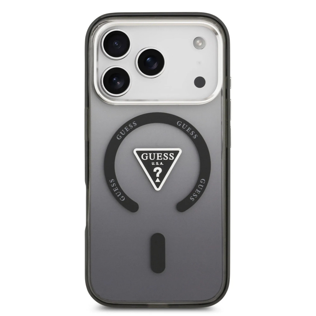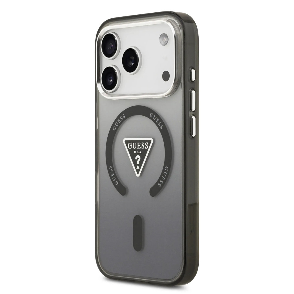 GUESS Magsafe IML Gradient Case With Print Triangle Logo & Metal Camera Buttons iPhone 17 Pro Max tok, fekete egy exkluzív védőtok-kollekció, amely kiemelkedő funkcionalitást ötvöz stílusos, egyedi дизайnnal. Ezt a kollekciót azok számára tervezték, akik nemcsak telefonjuk biztonságát, hanem elegáns megjelenését is értékelik.