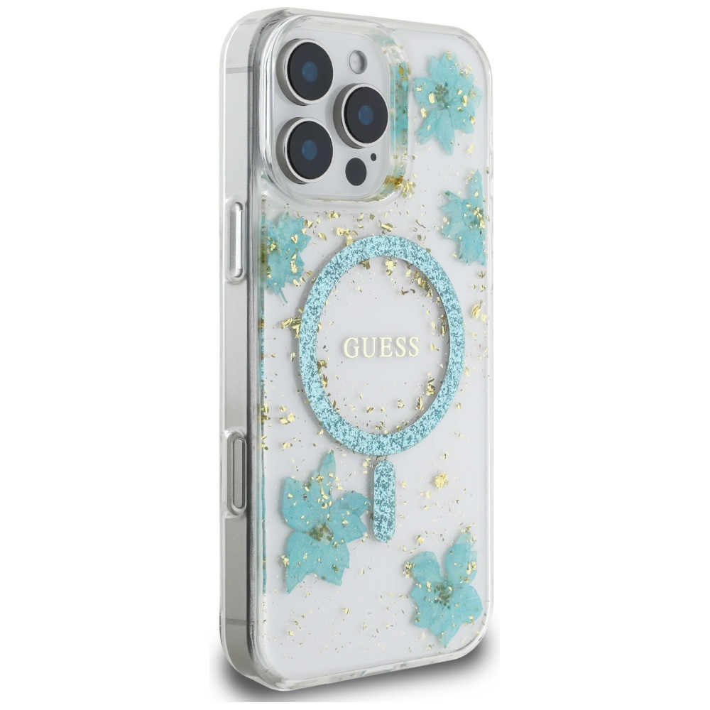 Guess Resin Flowers Glitter MagSafe iPhone 16 Pro tok, türkiszkék