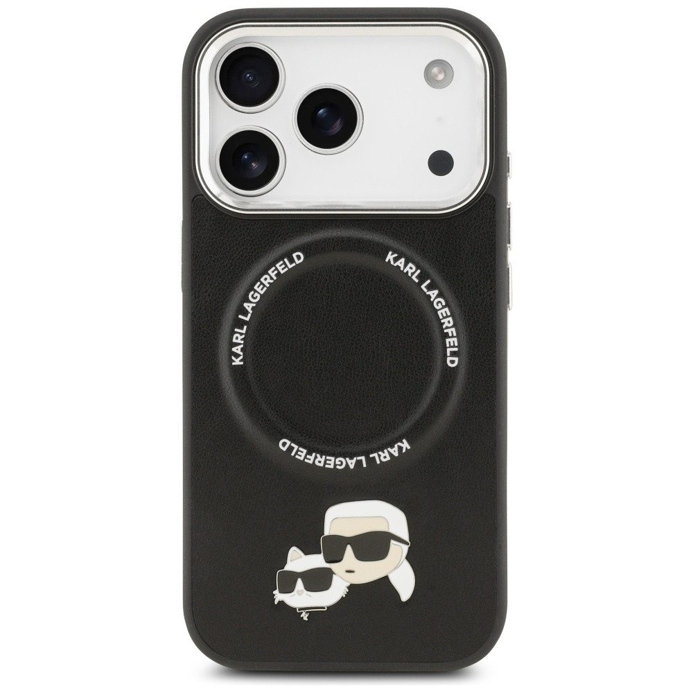 Karl Lagerfeld case Magsafe PU case with Karl&Choupette heads pins logo and metal camera buttons for iPhone 17 Pro black