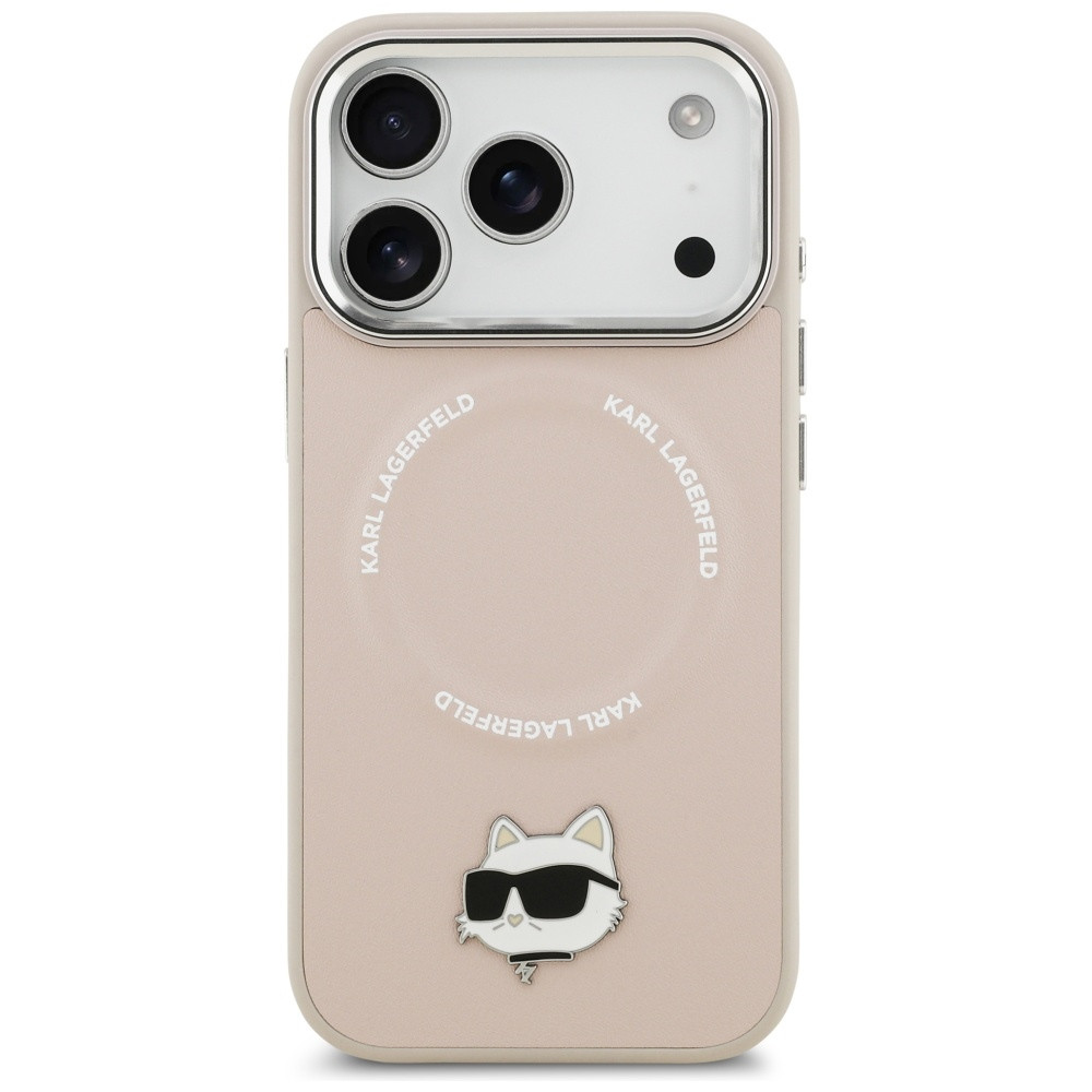 A hátoldalt díszíti a jellegzetes Choupette Metal Pin, amely divatos kiegészítőt ad az akseszsoárnak. A dizájnt kiegészíti az alumínium kamerakeret és ezüst színű oldalsó gombok, hangsúlyozva a termék luxus jellegét. A MagSafe gyűrűn szerepel a "KARL LAGERFELD" felirat, amely eleganciát és egyedi stílust kölcsönöz.