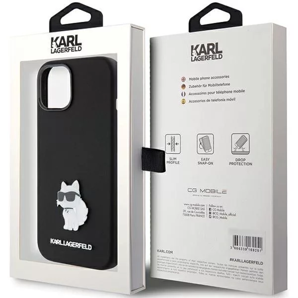 A védőtok-kollekciót egy nagyméretű, háromdimenziós fémtapasz díszíti, amelyen a különc tervező szeretett macskája, az imádnivaló Choupette látható. A megjelenést a Karl Lagerfeld logóval ellátott fémlemez teszi teljessé, megerősítve a termékek kiváló minőségét és hitelességét, amelyekért ez a neves márka felel.