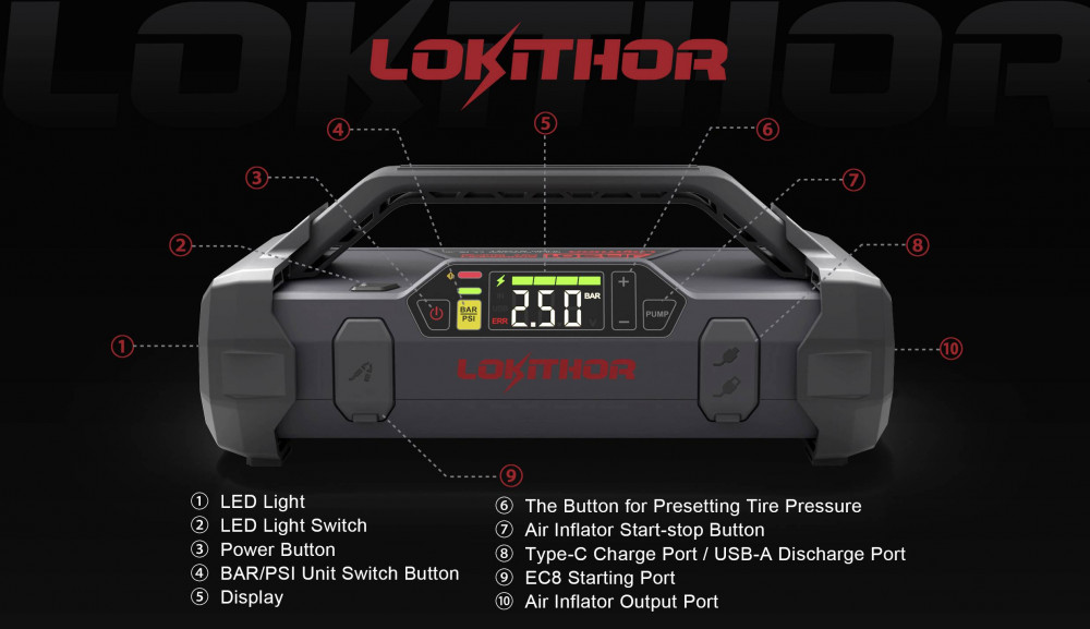 Powerbank és bikázó / Lokithor JA301 A Lokithor termék egy praktikus és többfunkciós eszköz, amely minden bizonnyal hasznos lesz az Ön számára. Az indítómotort széleskörű kompatibilitás jellemzi, így nem csak autóban, hanem csónakokban, kaszákban, lakóautókban, terepjárókban stb. is hasznos lesz. Számos biztonsági funkció garantálja a használat biztonságát, a powerbank funkció pedig lehetővé teszi, hogy például telefon vagy táblagép töltésére. A JA301 zseblámpaként is szolgál, amely megkönnyíti a láthatóságot sötétben. Megbízható Az indítóindító érzékeli a nyomást az abroncsban, tölti az akkumulátort, és váltani is tud a BAR / PSI egységek között. Az érzékelt nyomás pontossága ± 2 PSI. A maximális nyomás azonban eléri a 150 PSI-t. A JA301 3 féle felfújó tűvel van felszerelve, ami lehetővé teszi az autók, kerékpárok, kajakok, labdák stb. gumiabroncsainak levegőjének feltöltését. Széleskörű kompatibilitás A powerbank 2000A-es indítóárammal van felszerelve, melynek köszönhetően 1-3 másodperc alatt beindítja járművét. 8 literes benzinmotorokhoz és 6 literes dízelmotorokhoz alkalmas. Az eszköz használható járművekhez, például autókhoz, motorkerékpárokhoz, csónakokhoz, lakóautókhoz, ATV-hez, fűnyíróhoz és sok máshoz. Ezenkívül a JA301 készenléti üzemmódban akár 180 napig is működik, és kis mennyiségű áramot fogyaszt. Biztonságos a járművéhez A Lokithor termék valós időben érzékeli az akkumulátor feszültségét, és értesíti a felmerült hibáról. A készülék számos védelemmel is rendelkezik, például rövidzárlat, túlfeszültség és túlmelegedés ellen, így biztonságosan használható. Többfunkciós A készülék nem csak indítóként működik, hanem zseblámpaként és powerbankként is funkcionál majd, amellyel telefonunkat, táblagépünket és egyéb USB porttal rendelkező eszközeinket tölthetjük fel. A termék támogatja az USB 3.0 gyorstöltést. A LED-es zseblámpának viszont 3 üzemmódja van: szórt fény, villogó és SOS. A csomag tartalma: