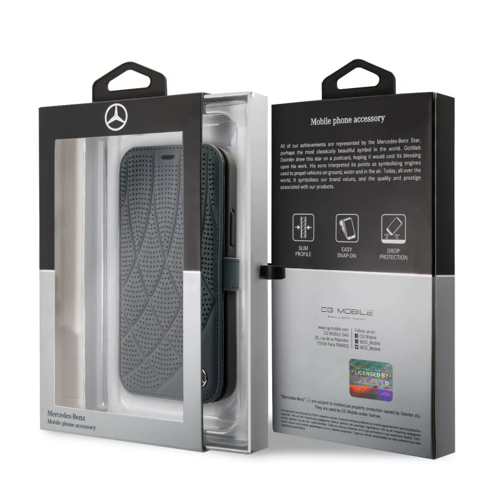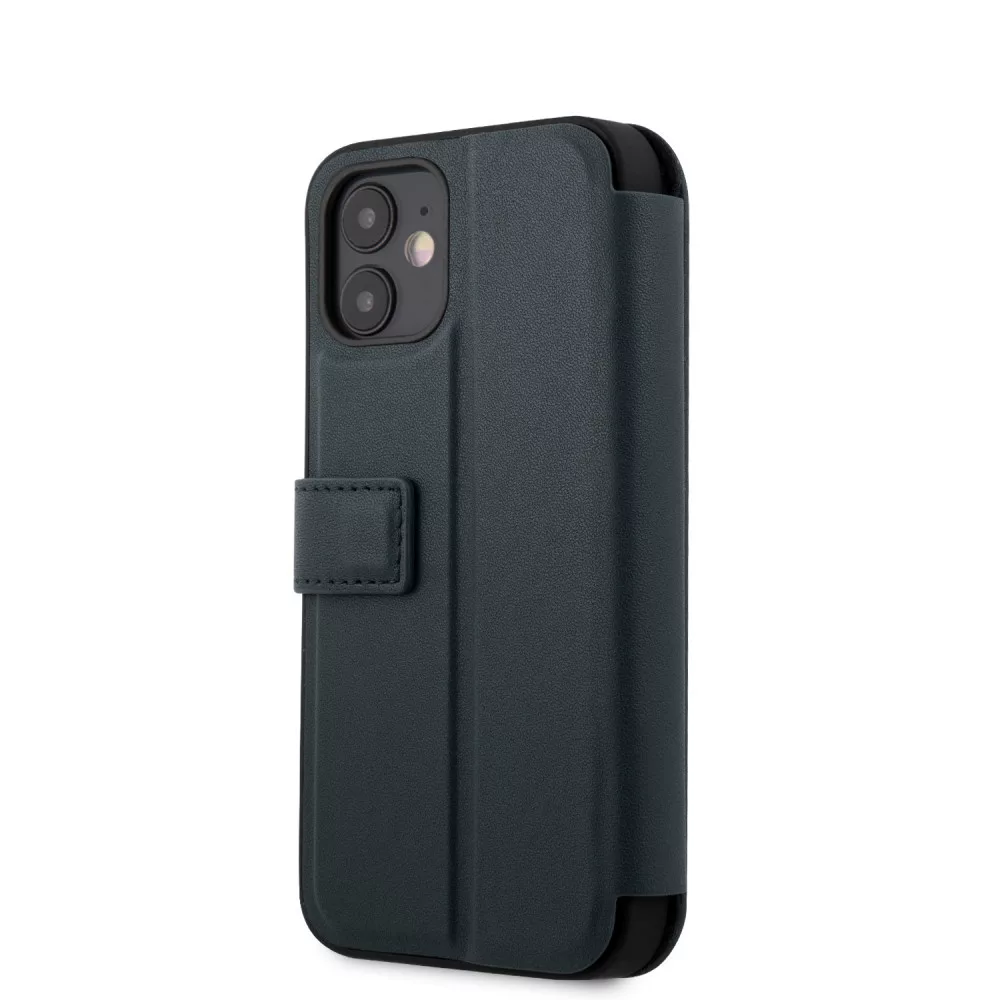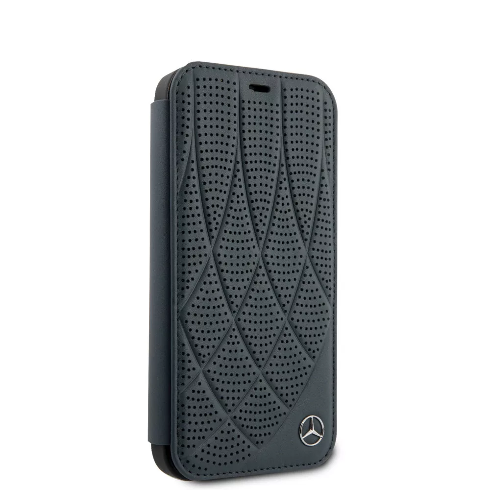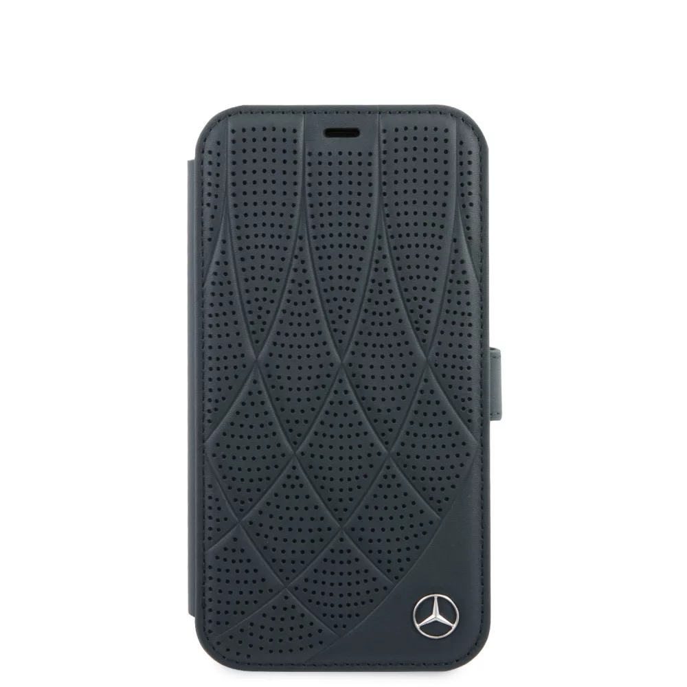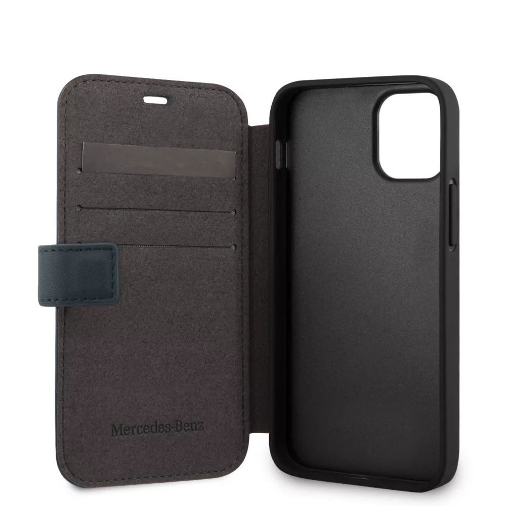 Mercedes-Benz iPhone 12 Mini 5,4" Genuine Leather (MEFLBKP12SDIQNA) eredeti bőr, oldalra nyíló tok, sötétkék