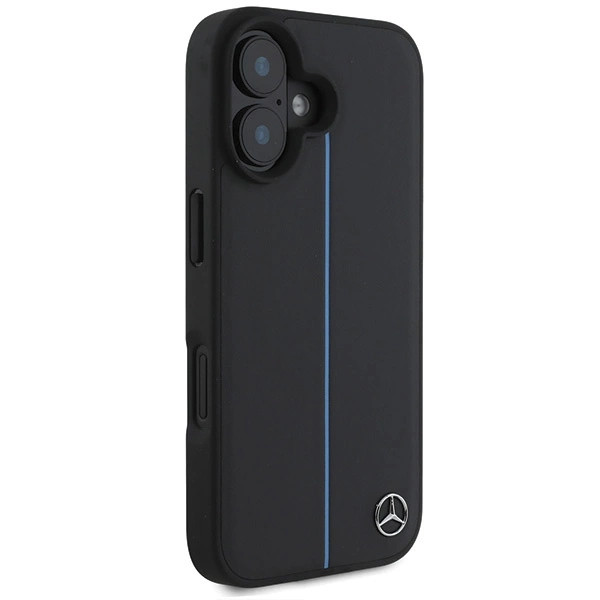 Blue Line Leather MagSafe, Ha természetes bőrből készült tokot keresel, amely kiváló minőségével lenyűgöz és a klasszikus eleganciát a modern stílussal ötvözi, a Blue Line Leather MagSafe sorozat olyan választás, amely megfelel az elvárásaidnak. Ideális választás minden MagSafe technológiával rendelkező készülék tulajdonosának., Különleges dizájn, A kollekció tokjai a luxus, a funkcionalitás és a modern technológia kombinációját képviselik. Valódi bőrből készülnek matt felülettel, amely elegáns, diszkrét megjelenést kölcsönöz. A közepén finom, dombornyomott kék csík fut végig, amely modern jelleget és különleges dinamikát ad a toknak, melyet a Mercedes-Benz logó tesz teljessé., Masszív kialakítás és tökéletes illeszkedés, A kollekció tokjait bőr felület jellemzi, amely biztos fogást nyújt és növeli az ellenállást az esésekkel és mechanikai sérülésekkel szemben. A tok belseje fekete matt polikarbonátból készült, amely védi a készülék hátlapját a karcolásoktól és további ütéscsillapítást biztosít. A tok oldalai rugalmas anyagból további védelmet nyújtanak ütések ellen. A gombok tökéletesen illeszkednek az összképbe, egyben kényelmes és precíz használatot biztosítva., A tok a Mercedes-Benz márka licencével készült., Műszaki adatok, Típus, Hardcase, Kollekció, Blue Line Leather MagSafe, Anyag, Valódi bőr / TPU / PC, Szín, Fekete, Kompatibilitás, iPhone 16 6.1"