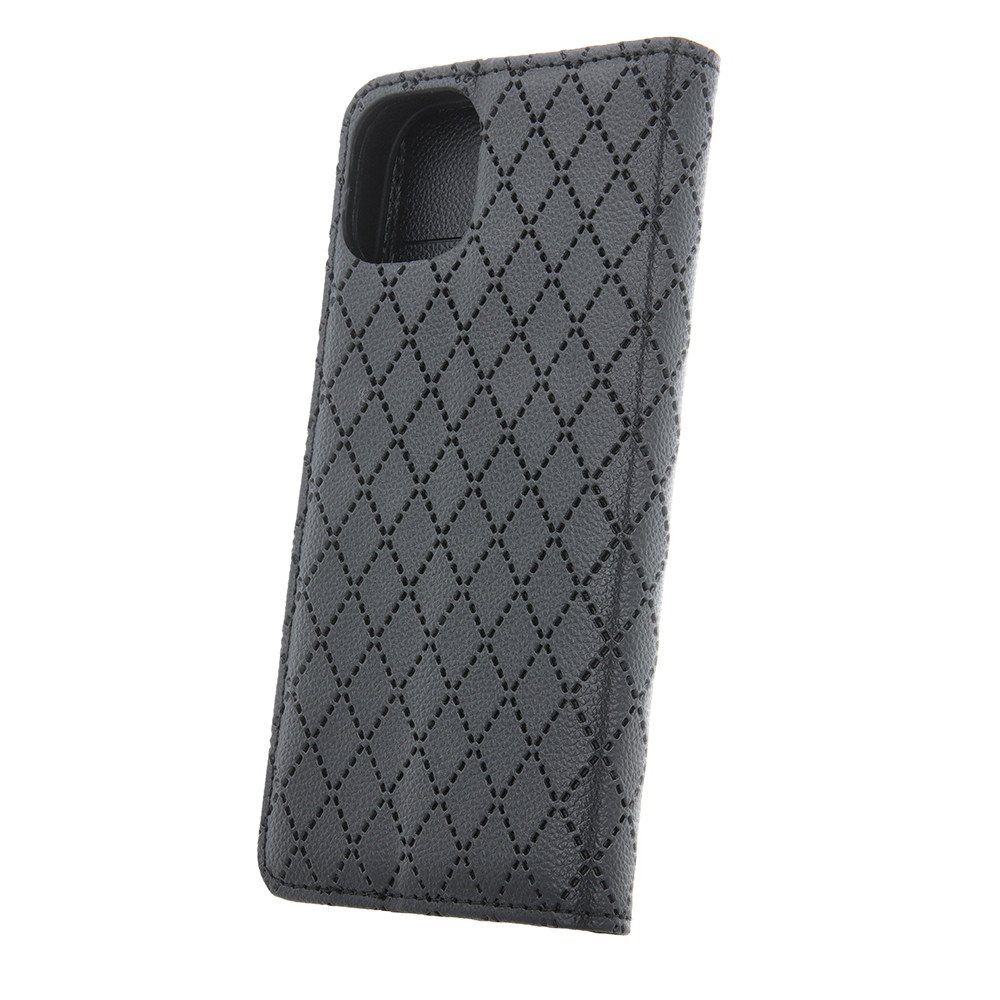 A Smart Caro telefontokot precízen, a részletekre ügyelve készítették. Műbőr bevonattal rendelkezik, jellegzetes kockás mintázattal. A jobb alsó sarokban egy fekete, kerek, fényesre polírozott gomb található. Ez az elegáns és funkcionális tok ideális védelmet nyújt az okostelefonnak, miközben egyedi jelleget kölcsönöz neki.