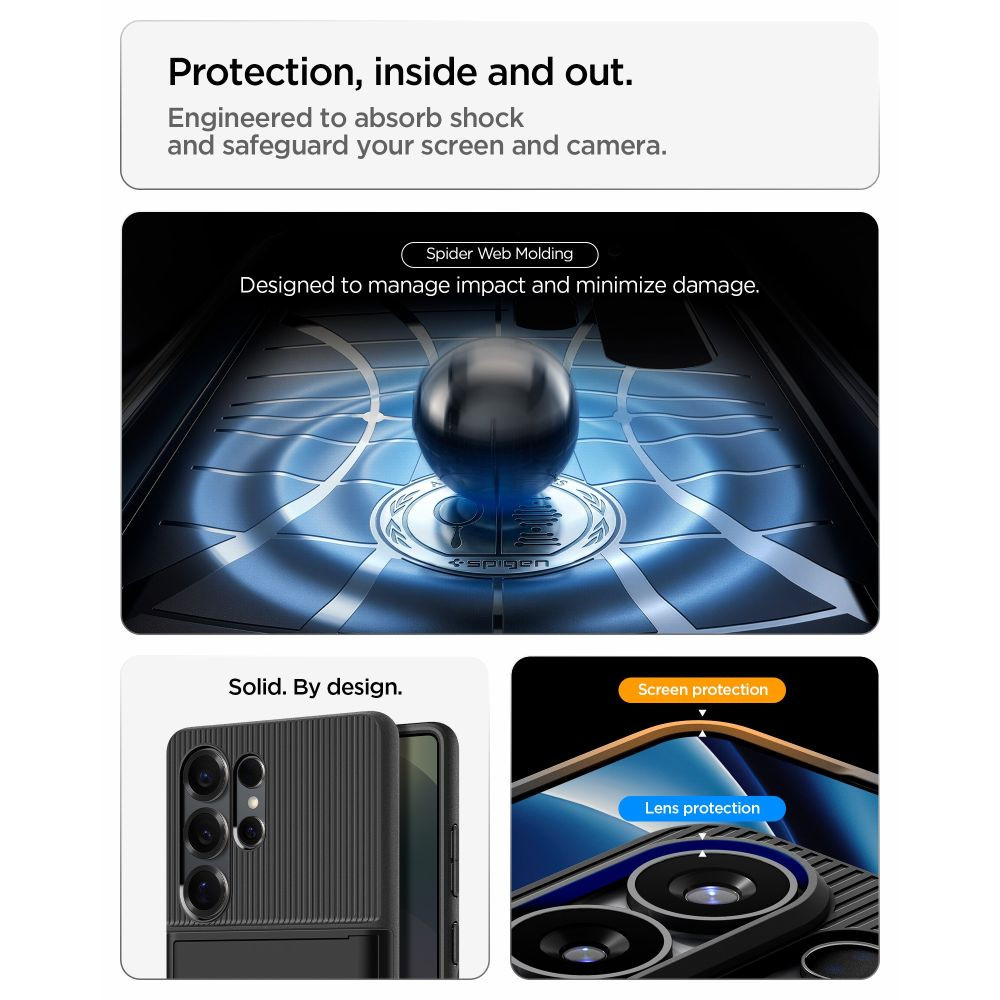 Spigen Slim Armor CS egy hibrid tok, amely fejlett védelmet kombinál egy praktikus, rejtett kártyazsebes megoldással. A merev polikarbonátból és rugalmas TPU-ból álló kétrétegű kialakítás katonai tanúsítvánnyal rendelkező védelmet biztosít, hatékonyan óvva a telefont a véletlen leesések során bekövetkező sérülésektől. A karcsú profil nem növeli feleslegesen a térfogatot, megtartva az eszköz kényelmes használhatóságát a mindennapokban.