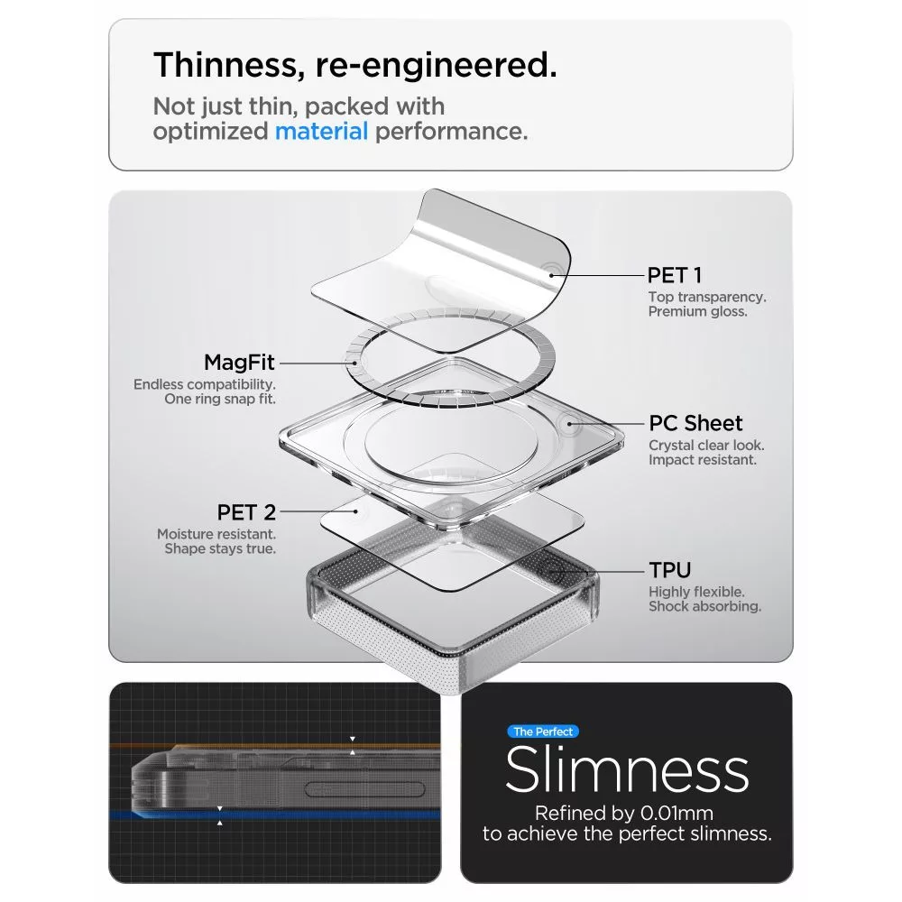 A tok rugalmas TPU keretet és merev polikarbonát hátlapot kombinál, így hozva létre egy hibrid felépítést, amely átfogó védelmet nyújt. A puha keret elnyeli az ütésekből és rázkódásokból származó energiát a mindennapi használat során, míg a kemény hátlap megvédi a készüléket a karcolásoktól és mechanikai sérülésektől. Az Air Cushion megerősített sarkok tovább csillapítják az esések energiáját, minimalizálva a készülék sérülésének kockázatát. A kijelző és a kamera körüli megemelt peremek megvédik a legérzékenyebb részeket a közvetlen érintkezéstől a felülettel.