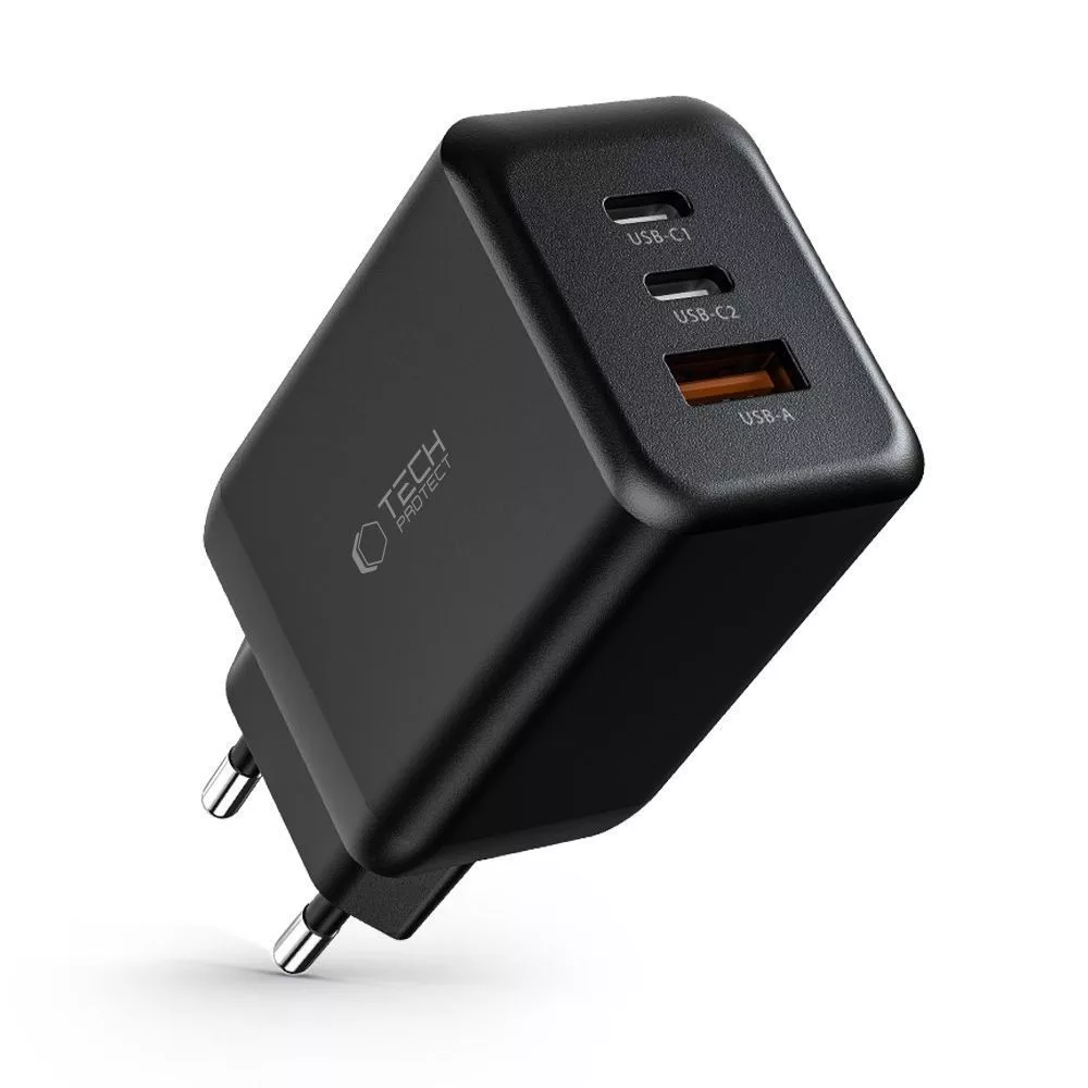 Tech-Protect C65W hálózati töltő 2x USB-C PD 65W / USB-A QC 3.0, fekete