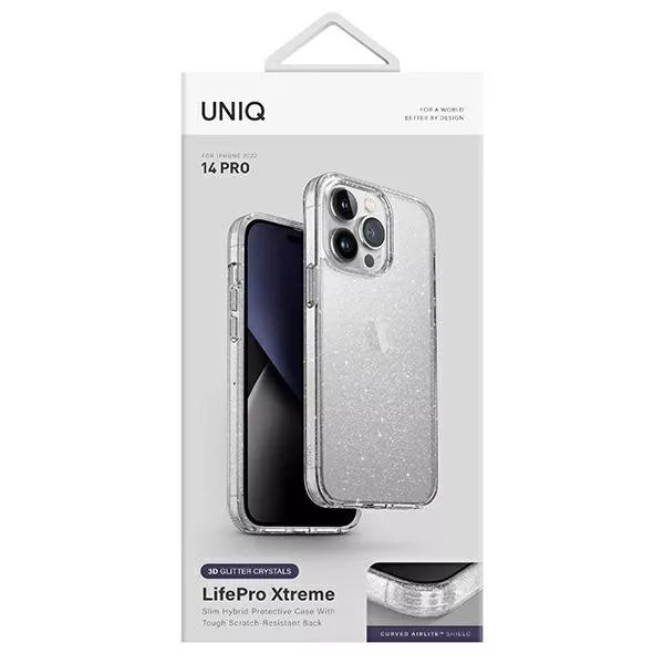 Az UNIQ LifePro Extreme egy hibrid tok, amelyet AirMax™ 360° technológiával terveztek; hatékonyan védi az iPhone-t a mindennapi veszélyektől, miközben vékony és átlátszó kialakításával hangsúlyozza annak természetes szépségét. A tokot csillámrészecskék borítják, amelyek a napfényben gyönyörűen ragyognak, luxus megjelenést kölcsönözve a telefonodnak.