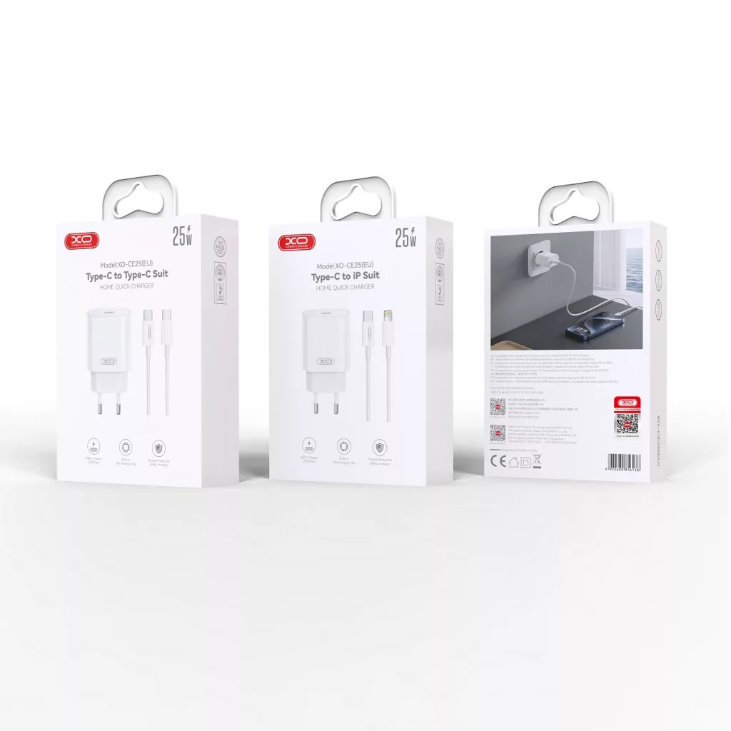 XO hálózati töltő CE25 PD 25W 1x USB-C, fehér + kábel USB-C - Lightning